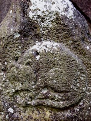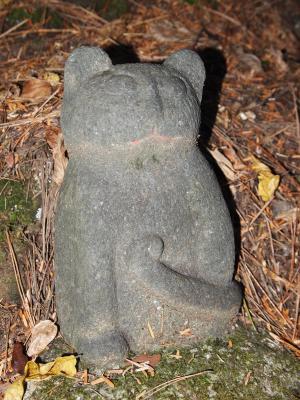 さて、伊那市にも猫を祀った面白い神様があります。猫神様は伊那市高遠町山室の川辺(かわべ)集落の裏山を少し登ったところにあります。細い急な山道をたどると、高さ25センチメートルほどの少し青みがかって、口元には紅が塗られデフォルメされた可愛らしい猫の石仏が座っています。地元の人に謂(いわ)れを尋ねましたが、いつ頃のものか、誰が作ったのか、なぜに猫なのかわかりません。同様に伊那市内には猫を祀った石仏が、西春近山本の公民館裏にもあります。こちらの猫はしっぽを巻いて眠っているようです。3体確認できました。いずれも可愛らしい写実的な石仏です。