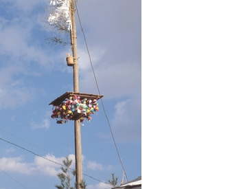 冬晴れの空に青・赤・黄色・緑・紫と、鮮やかな色紙袋が揺れています。「でえもんじ(大文字)」という、西箕輪上戸(あがっと)地区の小正月の風景です。袋の中には籾殻(もみがら)が入っていて、大人のこぶしほどの大きさでしょうか。地区の女性たちを中心に作りますが、縫い目はすべて右巻きで、左巻きはきつく禁止されています(現在はそうでもないようです)。元禄(げんろく)時代からと言い伝えられていますから、300年以上も前から伝わる伝統行事です。長さ12mほどの柱に、酒樽(さかだる)・青竹・色紙花・色紙袋・御幣(ごへい)を結びつけて、小正月の1月14日夜明け前に上戸地区の中心部、三ツ辻(みつつじ)に各戸から男衆が集まって建てます。「でえもんじ」には、厄払い(やくばらい)と五穀豊穣祈願(ごこくほうじょうきがん)が込められています。厄落としのほかにも、悪病が村に入ることを防いだり、家内安全や縁結びなども込められているかもしれません。今日のような生活様式のなかでは、こうした伝統行事や伝統芸能、民間信仰などは失われがちですが、上戸地区に伝わる「でえもんじ」は、いつまでも伝えていって欲しいものです。そして、1月20日の早朝に「でえもんじ」を倒し、色紙袋や色紙花などの飾り物はそれぞれ家に持ち帰ります。色紙袋は神棚に、色紙花は玄関先に供えます。前年の飾り物は「どんど焼き」で燃やしますから、上戸地区のどんど焼きは1月20日過ぎとなります。私が小学生だった頃、学校の行き帰りにわざわざ回り道をして、「でえもんじ」を見るのが楽しみでした。下校時の夕方にはあったのに、翌朝登校するときにはすっかりなくなっているのが不思議・不思議だったことを思い出します。