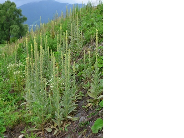 ビロードモウズイカのなかに白く咲いているヒメジオンも北アメリカ原産の帰化植物です