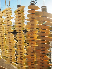 何度か強い霜にあてないと柔らかく美味(おい)しくならないからと、毎年わが家の野沢菜の収穫とお菜洗いは、霰(あられ)の降るような11月下旬か12月の寒い時季になります。霜柱の融(と)けた、ぬかるんだ畑で、野沢菜が土で汚れないように、丁寧に包丁で根元から切っていきます。ひとかかえもある菜っ葉の束がいくつかできると、家の横の小さな用水まで運んで、大きな木の桶(おけ)に水を張って、母や家内が冷たい水に手を入れてお菜洗いです。家の外壁には父が収穫してきれいに洗われた大根が、何列も簾(すだれ)のように垂れ下がって揺れています。400本もあるでしょうか。陽に輝いて美しい伊那谷の農村風景です。わが家では、冬を前に大根と野沢菜を漬けます。そして野沢菜が漬かるまでは、切り漬けと呼ばれる即席の漬け物が毎回の食卓に登場します。12月頃には大根、干し柿、1月になると凍りもちが軒下に揺れます。こうした風景は、どこの家でも普通にありましたが、最近はめっきり少なくなった気がします。ところで伊那市西箕輪羽広には、古くから地域に伝わる「羽広かぶ」という伝統野菜があります。知る人ぞ知る、実は有名な漬け物なのです。先が白く、太い根元が薄紫色のかぶは、酒粕(さけかす)と味噌(みそ)と適量の砂糖で、大きな桶に漬け込みます。そしてちょうど飴(あめ)色になった、1月か2月の極寒の頃に食べ頃になります。私の大好きな漬物のひとつです。味覚、歯ごたえ、辛味など、すべてが100点満点の絶品です。伊那谷の冬の風景がギュッとつまったふるさとの味です。みはらしファームなどで売られていますが、もっともっと力を入れて、信州を代表する漬物に変身できるものと確信しています。
