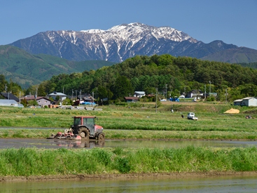 秋、西駒ヶ岳に新雪が降って、いよいよ冬がやってくる頃には、里では柿の実がつやつやと輝いて、眩(まぶ)しいばかりの紅葉が伊那谷を染めていきます。春、方々(ほうぼう)で満開の桜が風にゆれ、まだ眠たそうなカラマツ林の芽吹きの向こうに、たっぷりと残雪を纏(まと)う仙丈ヶ岳の姿が望めます。そして残雪の消長(しょうちょう)を見ながら農事の営みを繰り返している、これらは伊那谷の平凡ないつもの風景です。