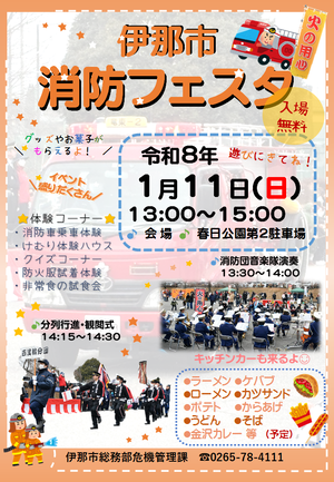 同日、伊那市消防団が主催する令和8年伊那市消防フェスタを開催しますのでぜひご来場ください。