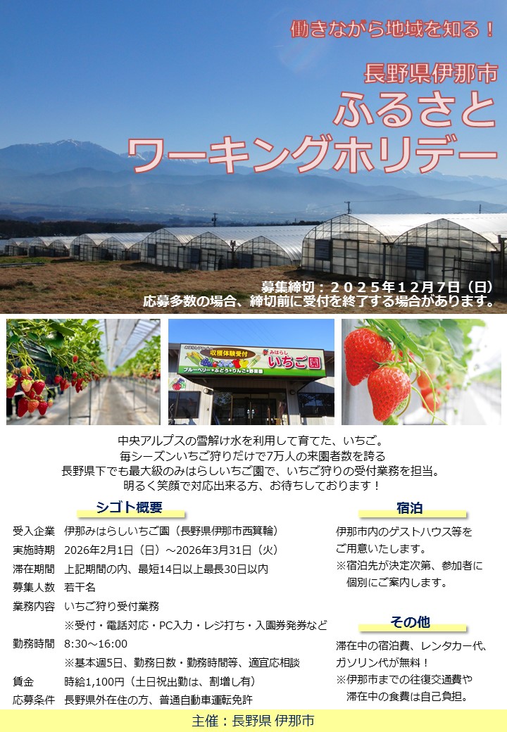 【伊那みはらしいちご園】伊那市ワーキングホリデーチラシ(PDF:918KB)