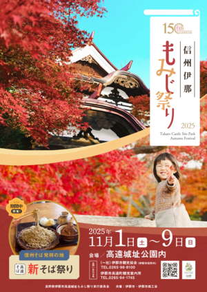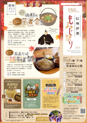 「日本100名城」にも選定されている高遠城址公園は、例年11月上旬から中旬にかけて約250本のカエデが色づきます。今年は高遠藩主保科正之公の足跡にあやかり、山形県から「出張!芋煮会」がやってきます。