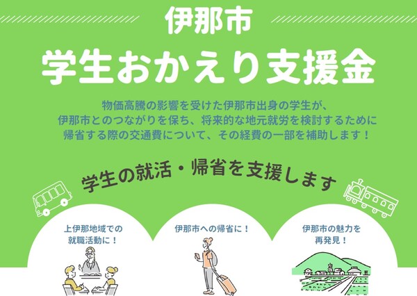 物価高騰の影響を受けた伊那市出身の学生が、伊那市とのつながりを保ち、将来的な地元就労を検討するために、帰省する際の交通費について、その経費の一部を補助します。