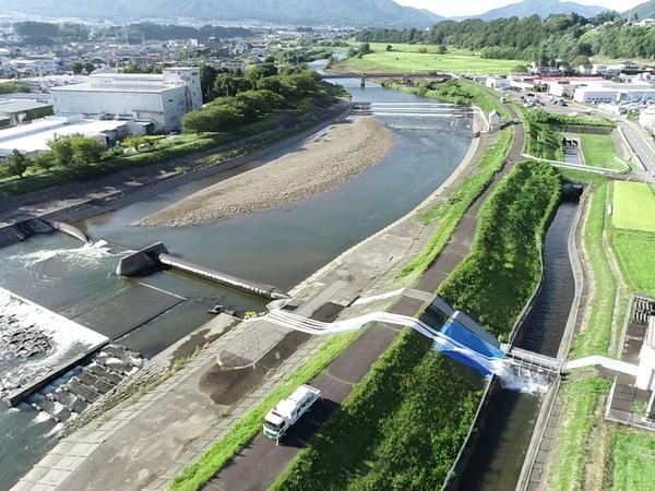 三日町の頭首工から取水された水は、伊那市・箕輪町・南箕輪村の農家、約950名の水田約250haに供給されています。堰を管理している「上伊那郡伊那土地改良区」から伊那市に至急の連絡が入りました。担当課では緊急会議を開き、「高温障害で水が必要な田んぼに水を送らなければならない」、「修理には時間がかかるため、ポンプ車で取水するのが最善策であろう」となりました。まず国土交通省天竜川上流河川事務所と、農林水産省関東農政局にポンプ車の出動要請を行いました。3日後には国土交通省のポンプ車が、その後農水省技術支援チームのポンプ車が出動してくれました。ポンプ車2台で昼夜を問わず取水してくれたおかげで、水不足はひとまず凌ぐことができたのです。