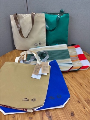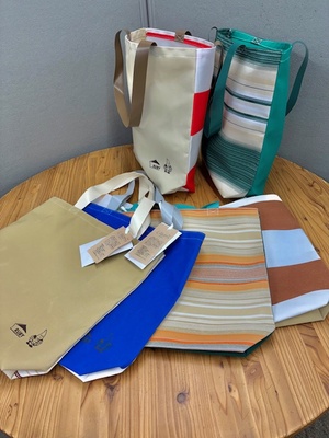 「地域企業とつくるグッズ製作~多様性×混ざり合い=唯一の魅力~」として、タカノ株式会社様で製作している大型パラソルなどに使用されている生地の端切れを活用したアップサイクルトートバッグを製作しました。