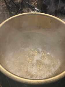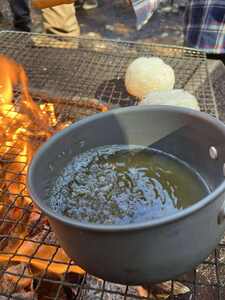 タンクに貯まった樹液を、はじめは大きな鍋に入れてたき火の上へ。