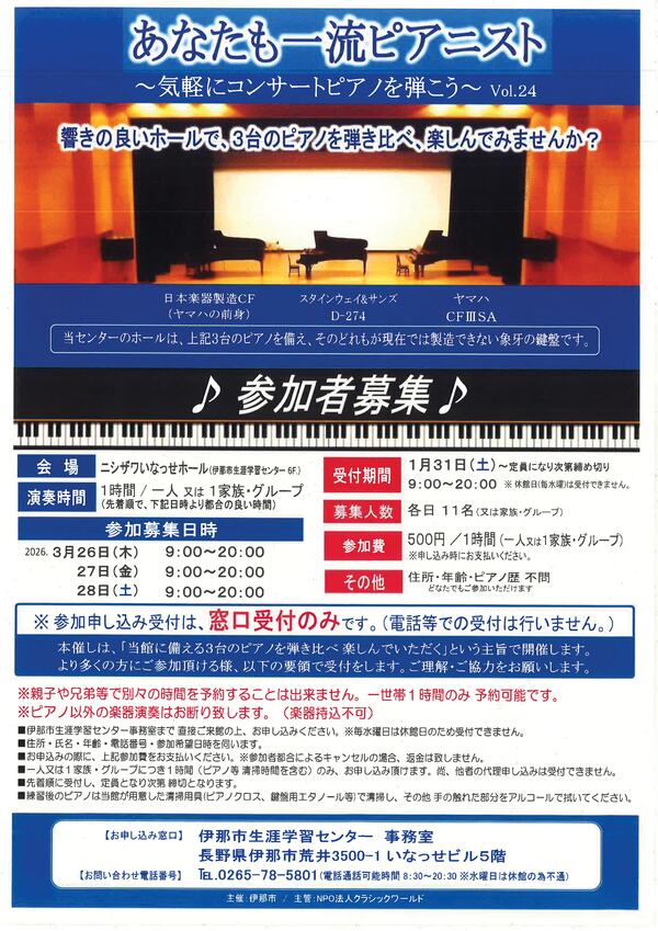 あなたも一流ピアニスト 気軽にコンサートピアノを弾こう Vol.24参加者募集