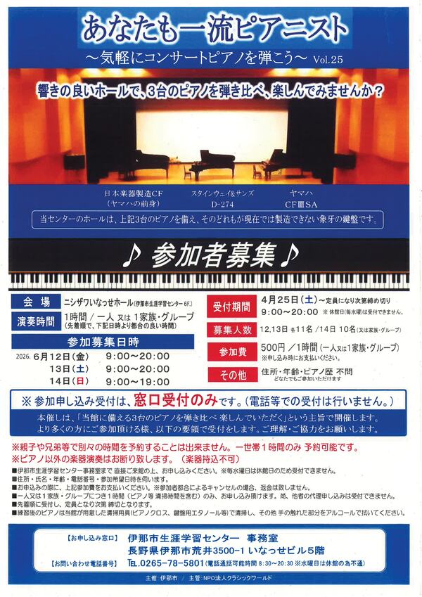 あなたも一流ピアニスト 気軽にコンサートピアノを弾こう Vol.25参加者募集