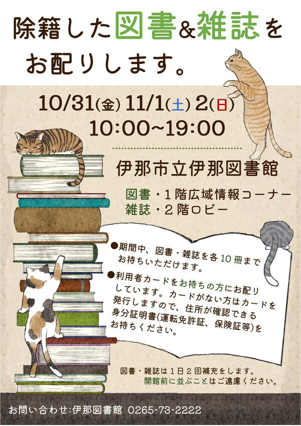 汚れや傷みのため貸出に適さなくなった本や、内容が古くなった本、保存期限を過ぎた雑誌などを無料でお譲りします。