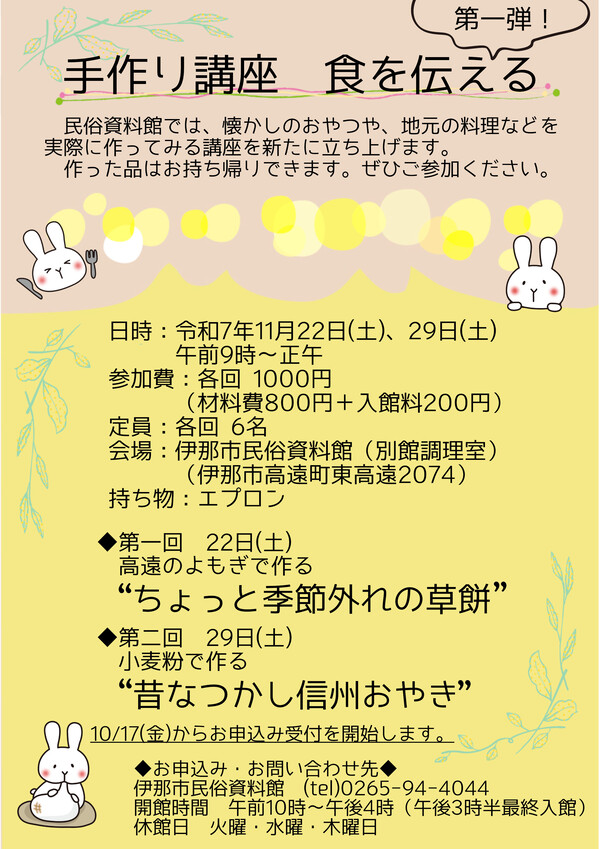 伊那市民俗資料館では、懐かしのおやつや、地元の料理などを実際に作ってみる講座を新たに立ち上げます。